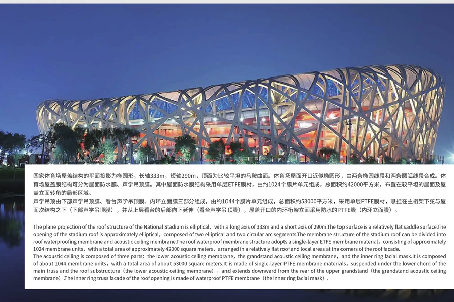 項目介紹:國家體育場屋蓋結構的平面投影為精圓形,長抽333m,短軸290m,頂面為比較平坦的馬鞍曲面。體育場屋面開口近似確圓形,由兩條橢圈線段和兩條圓線段合成。體育場屋蓋膜結構可分為屋面防水膜、聲學頂膜。其中屋面防水膜結構采用單層ETFE膜材,由約1024個膜片單元組成,總面積約4200平方米,布置在較平坦的屋面及屋藍立面轉角的局部區(qū)域。聲學吊頂由下部聲學吊頂膜、看臺聲學吊頂膜、內環(huán)立面膜三部分組成,由約1044個膜片單元組成,總面積約53000平方米,采用單層PTFE膜材,懸掛在主析架下弦與屋面次結構之下(下部聲學吊頂膜》,并從上層看合的后部向下延伸(看臺聲學吊頂膜》,屋蓋開口的內環(huán)架立面采用防水的PTFE膜(內環(huán)立面?!贰?/div>