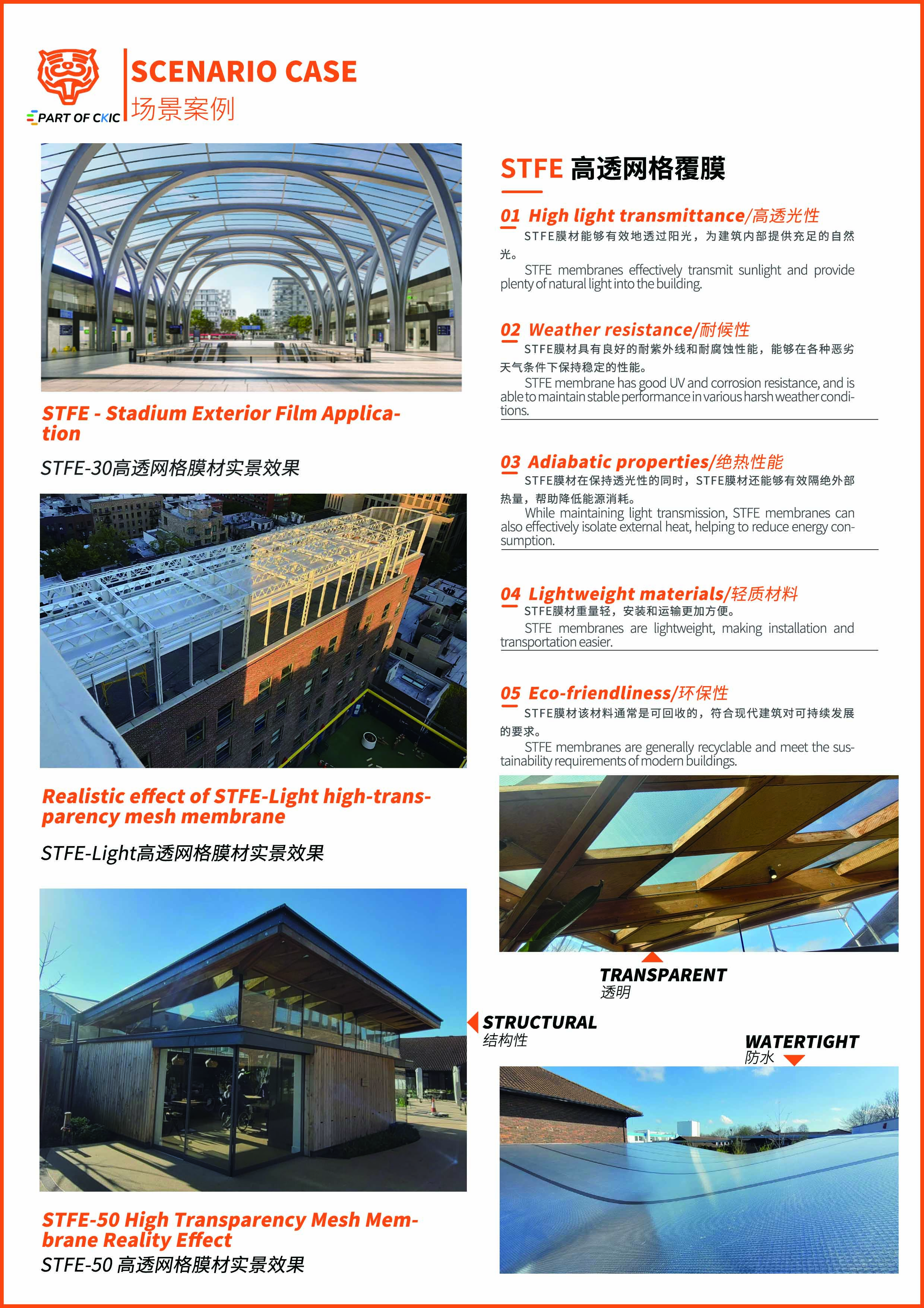 STFE建筑膜材是一種輕量、高性能、耐高低溫和抗紫外線的環(huán)保膜材料,廣泛應(yīng)用于現(xiàn)代建筑的外立面和幕墻設(shè)計(jì)。" />