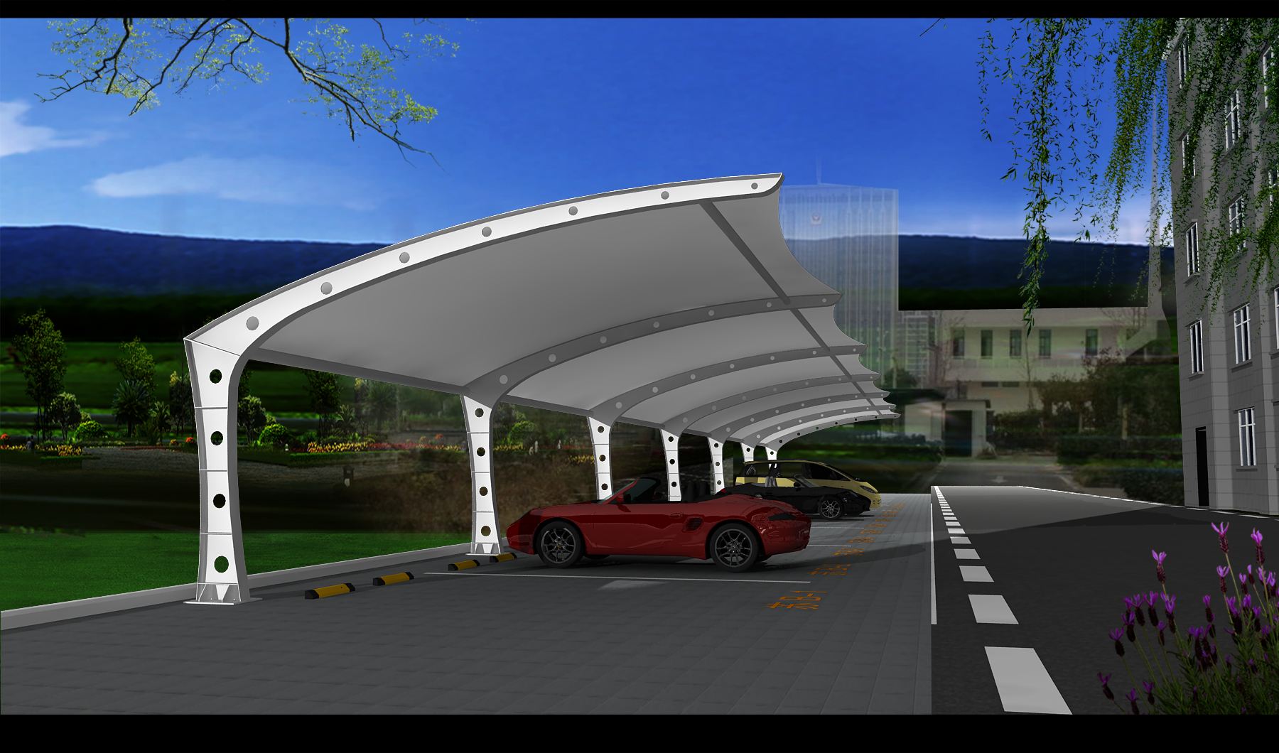 膜結(jié)構(gòu)停車棚構(gòu)造其實很簡單,主要是利用高強度膜結(jié)構(gòu)的布和支架來搭建起來的簡單建筑,利用膜結(jié)構(gòu)材料良好的張性覆蓋在支架上。從停車棚的結(jié)構(gòu)形式上看,與以前是車棚有很大的不同,只要準備好材料就可以施工了。